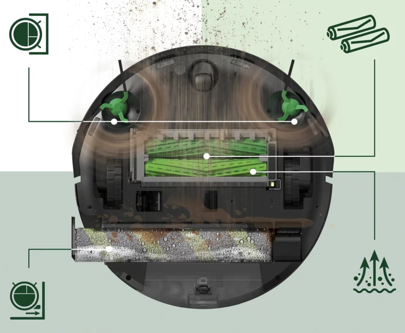- Aplikace iRobot Home – volba místností a zón, 4 úrovně sacího výkonu, 3 úrovně dávkování vody, možnost opakovaných průjezdů.