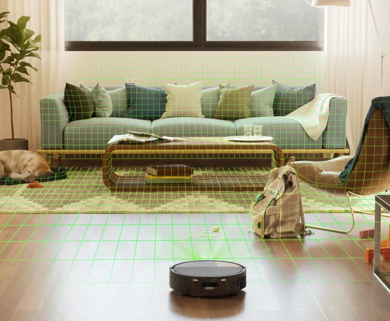 Diskrétně ukrytý laser vytváří přesné 3D mapy vašeho domova a automaticky pojmenovává místnosti pro efektivní a spolehlivý úklid i ve tmě.